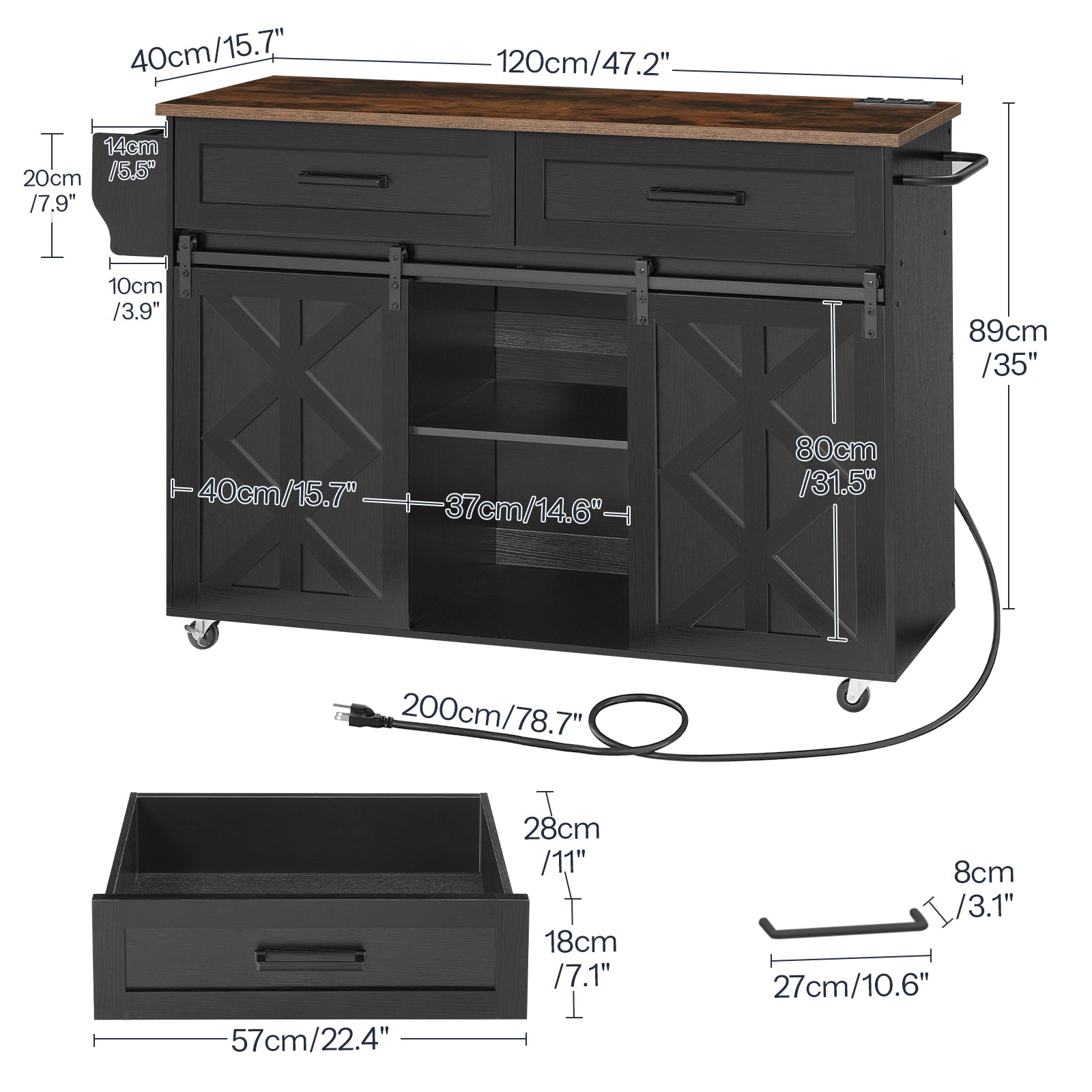 - Elegant Craftsmanship and Enduring Performance: The barn doors of the kitchen island on wheels are crafted with a unique framing process, adding a touch of elegance and ensuring long-lasting use. It combines aesthetics with functionality for your kitchen