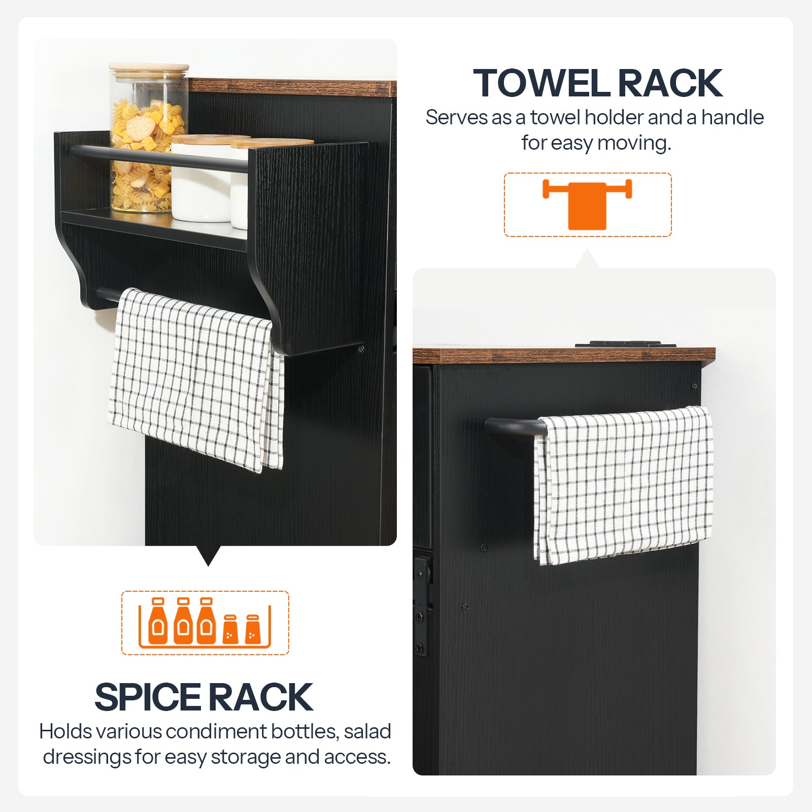 - Versatile Use: Enhanced with a towel rack and a side handle, this kitchen island with storage adapts to various roles. It's perfect for kitchen storage or as a living room coffee table. From towel hanging to daily item organization, it handles it all with ease