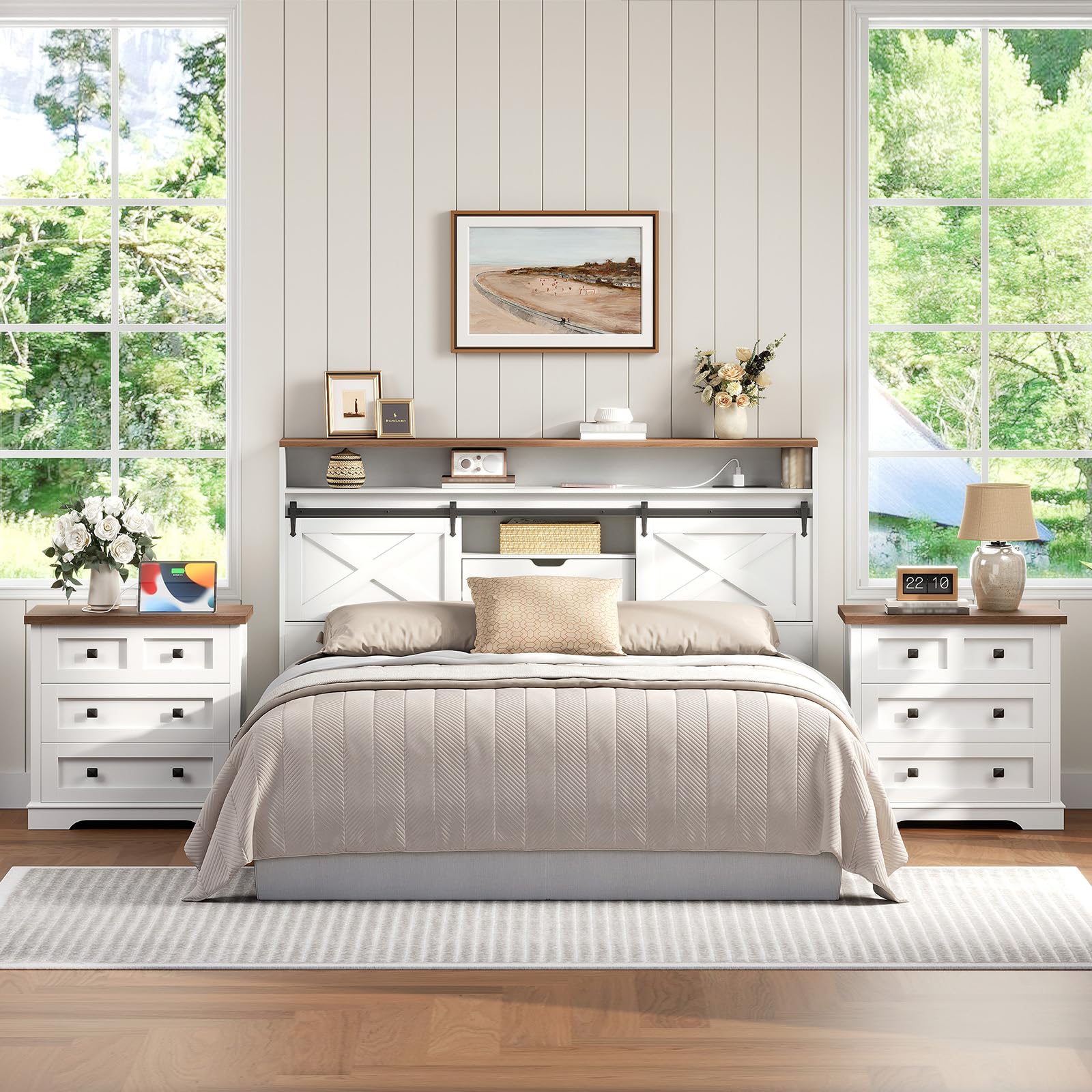 - Rustic yet Modern Design: The large end table with a charging station combines a white body with a walnut tabletop, merging modern and farmhouse elements. The black metal handles enhance its elegance. It adds a touch of rustic charm to bedrooms or living rooms