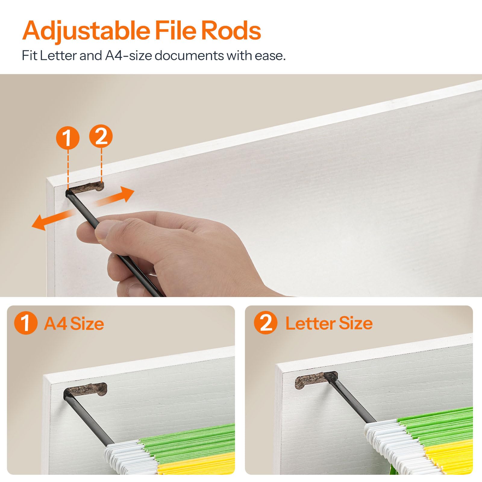 - Adjustable Hanging Rods - Customizable File Organization: Each file drawer in this cabinet comes equipped with adjustable hanging rods, making it easy to organize both A4 and Letter-sized files. The top drawer features a locking mechanism, offering secure storage for your important documents and personal items, ensuring both organization and privacy.