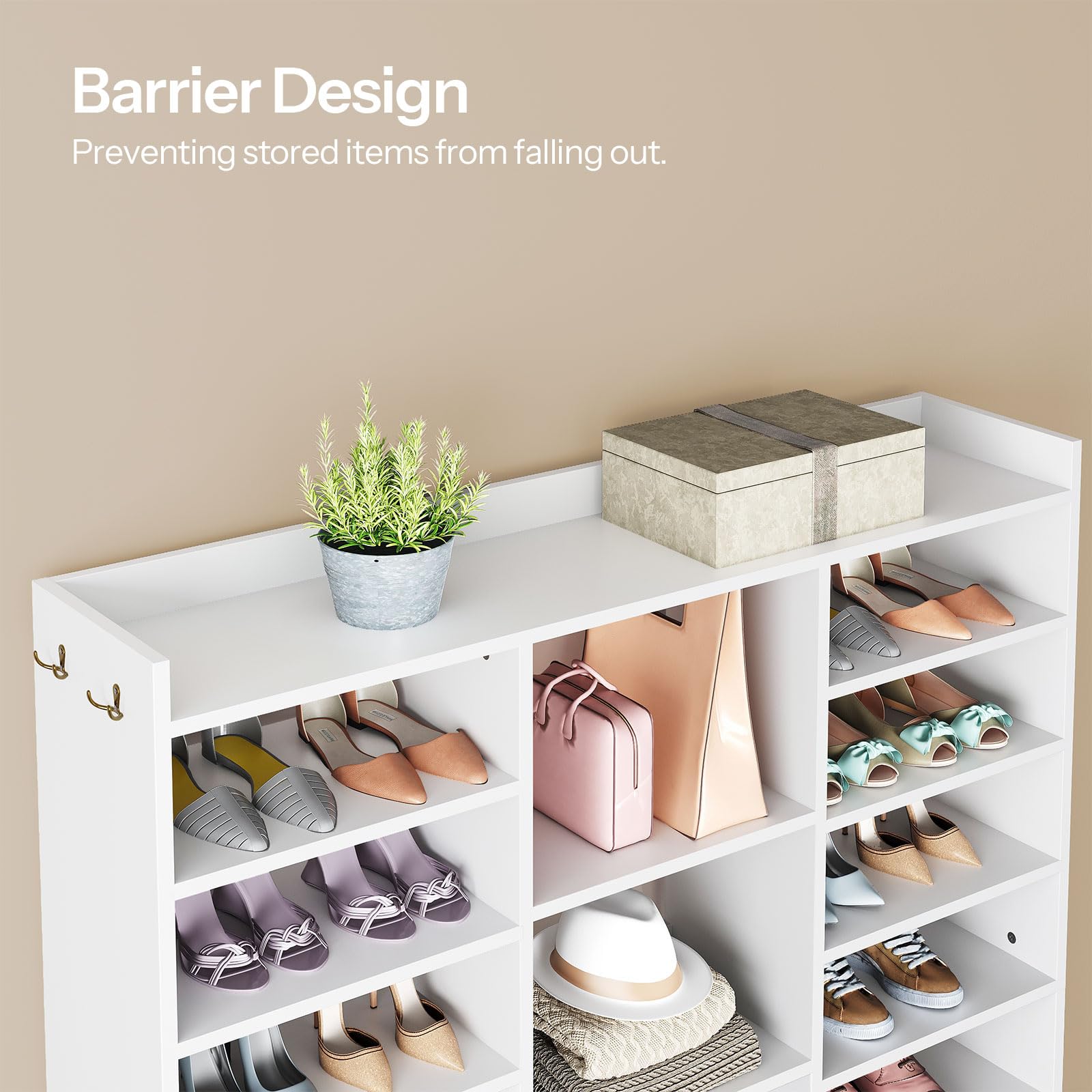 - Solid and Secure - Durable Construction for Long-Lasting Use: Crafted from premium particleboard, this large shoe rack is built to last. Each tier supports up to 11 pounds, and the sturdy construction ensures your shoes and accessories stay securely stored. The bottom foot nails protect your floors from scratches, while the back anti-tip device ensures added safety by preventing accidental tipping.