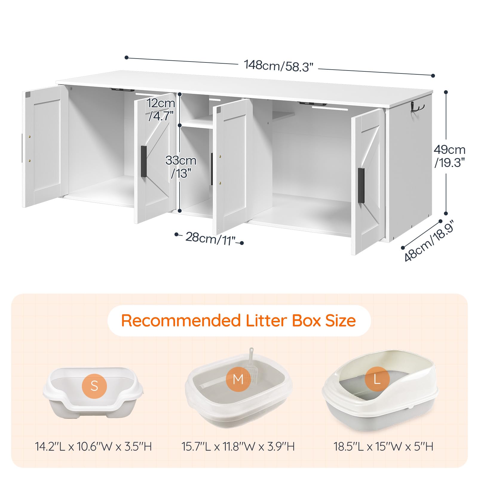 - Dual Litter Box House Design: This cat litter box enclosure, with a size of 58.3"L x 18.9"W x 19.3"H, comfortably accommodates two litter boxes (up to 58.3"L x 18.9"W) or two cat beds, or one litter box and one bed, ensuring each feline enjoys private space