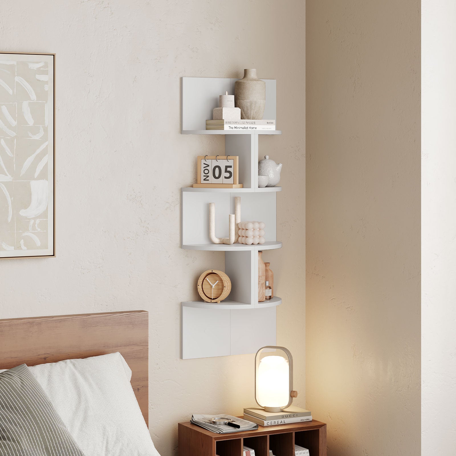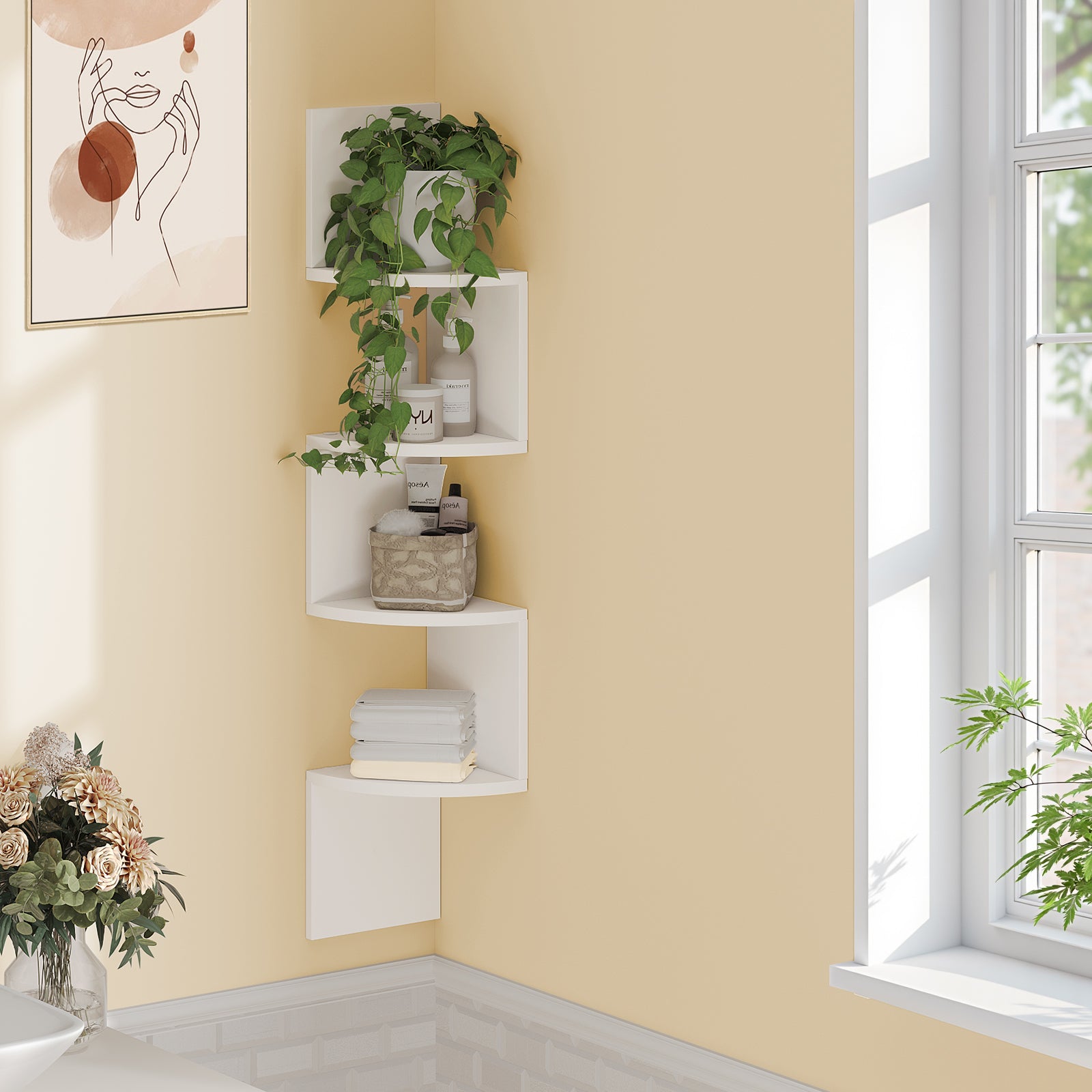 - Versatile Duo for Flexible Configurations: This 4-tier corner wall-mounted shelf offers flexible configurations to perfectly adapt to your needs. Whether used for display in the living room or bedroom, or for storage in the study, this 2-piece floating corner shelf set creates a more organized space and enhances your quality of life.