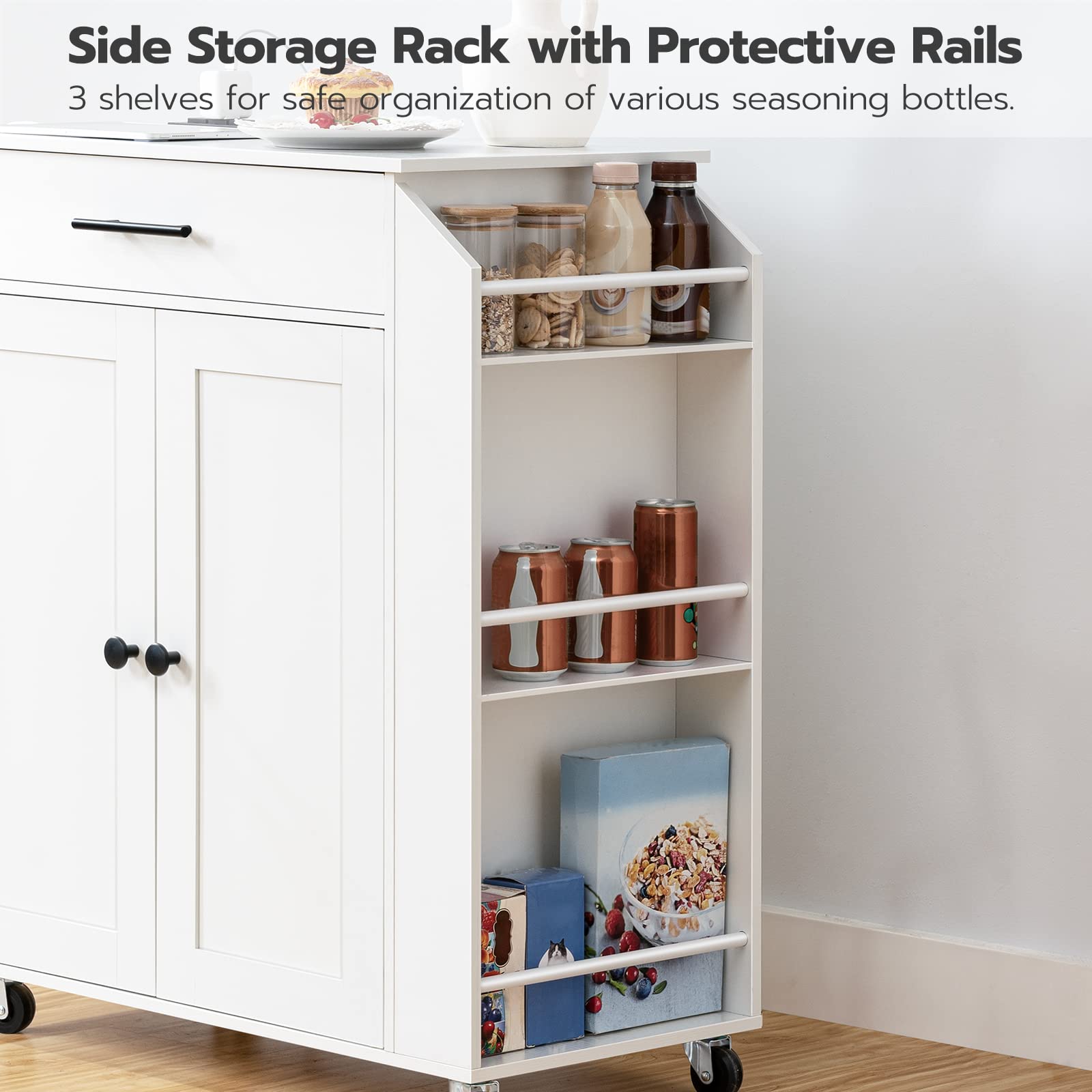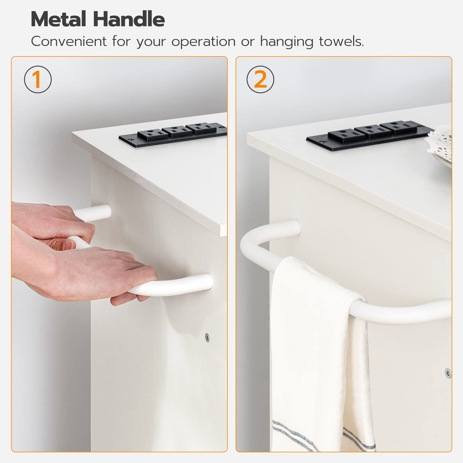 HOOBRO White Wheeled Movable Kitchen Island with Power Outlet & Spice Rack & Drawers