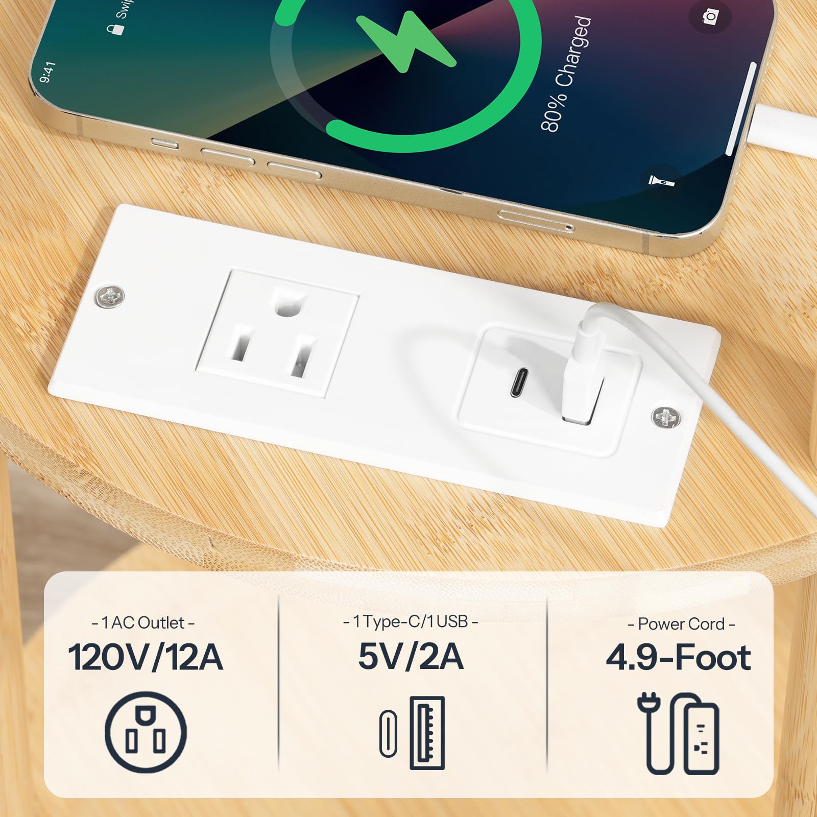 - Handy Charging Station: The side table features a charging station with an AC outlet, a USB-A port, and a Type-C port with a 4.9-foot-long power cord for you to conveniently charge devices like phones, headphones, and lamps by your bed or couch, offering both convenience and flexibility